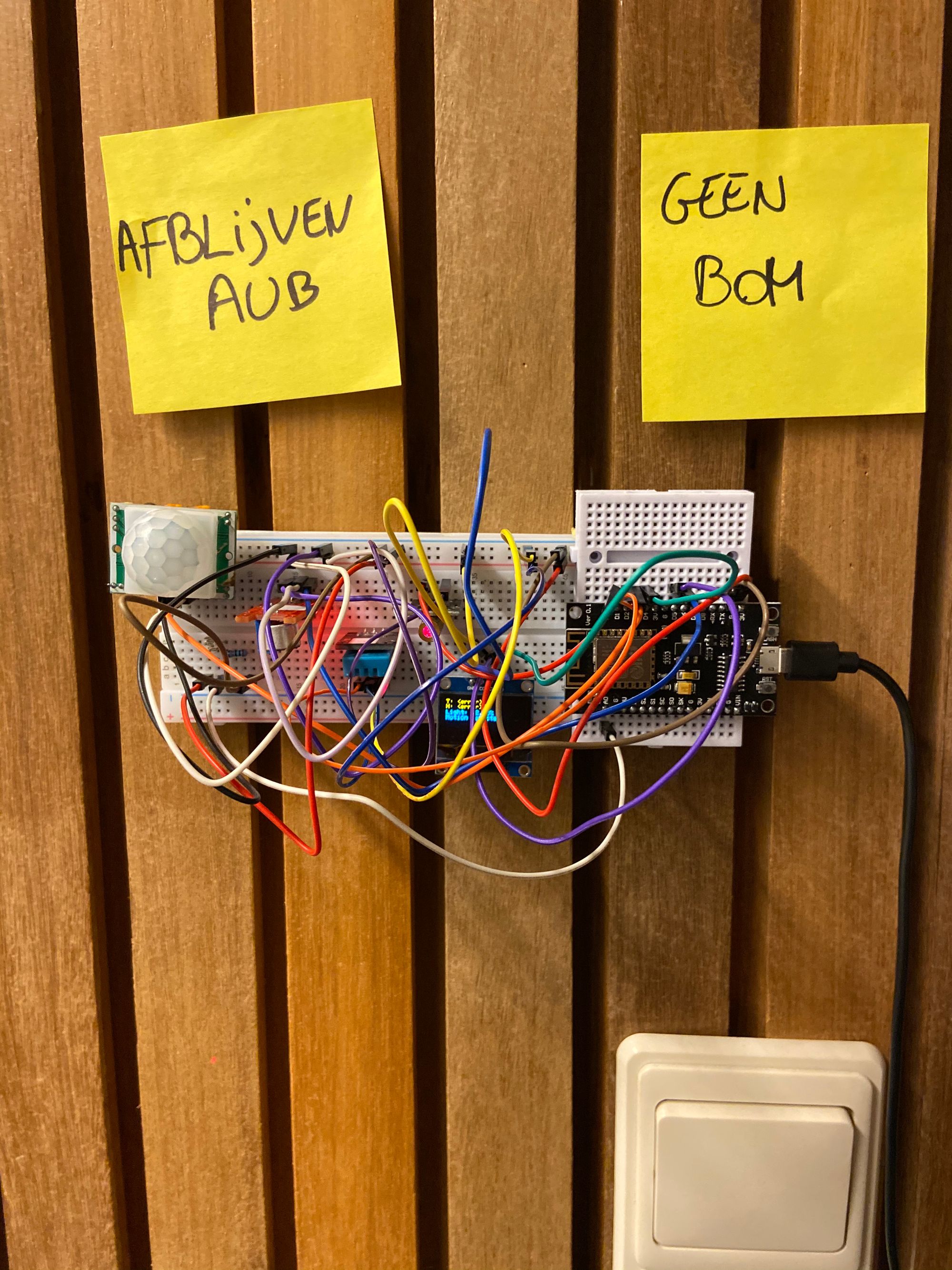 Many wires, a motion sensor, a light sensor, a microphone, a temperature and humidity sensor, a screen, and a laser beam. This thing is still hanging up in our meeting room at VRT and, of course, is total overkill to see whether the lights are on.