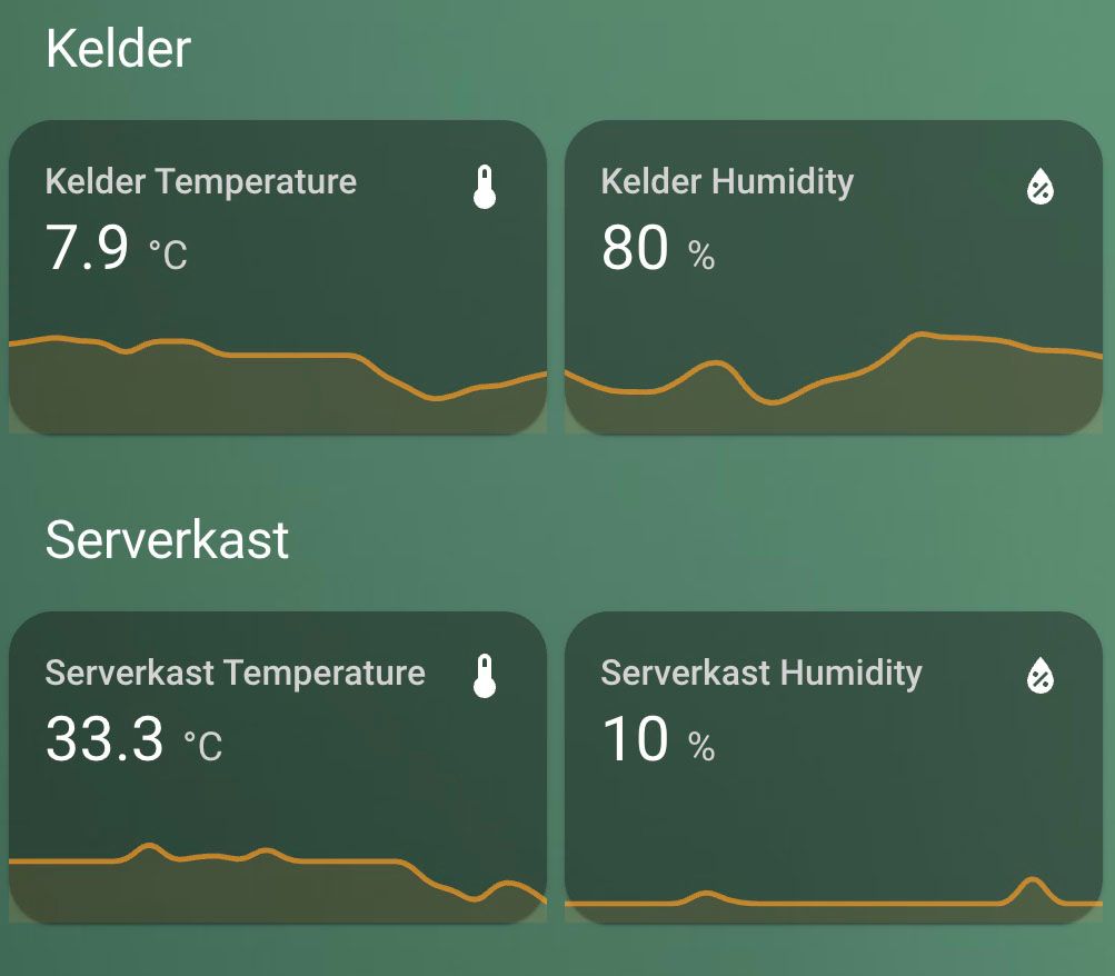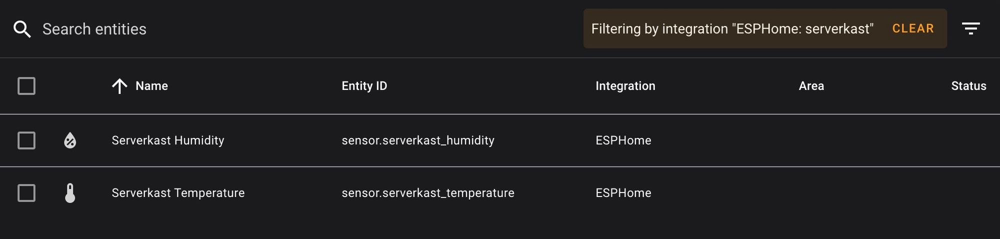 Of course, this does absolutely nothing. So it’s time to connect some sensors. Inside my server cabinet, there is an ESP8266 with a DHT11 temperature and humidity sensor connected to PIN D2. In the configuration file, this becomes (beneath ota:):