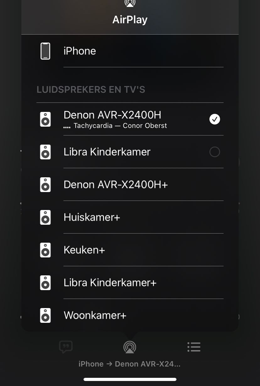 AirConnect brengt redding. Dit is een tool die langs de ene kant naar AirPlay luistert en langs de andere kant wat Sonos en Google-apparaten kunnen verstaan praat. Na de installatie ervan zie je alle speakers waarop je daarvoor niet kon afspelen gewoon in het AirPlay lijstje staan (met een + achter, zodat je ze nog uit elkaar kan houden):