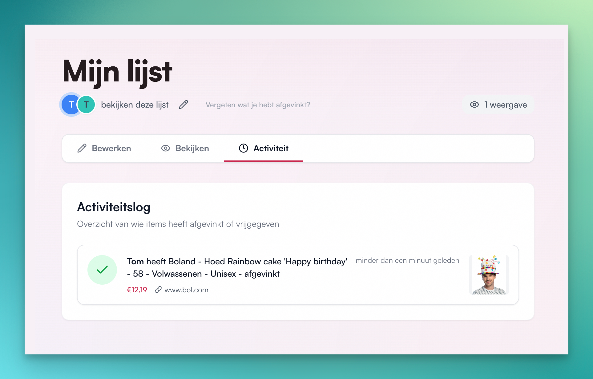 On top of all that, Lijsje now shows a live overview of everyone currently viewing the list. So yes ā you can see the exact moment tante Jeannine is buying your pair of Happy Socks.