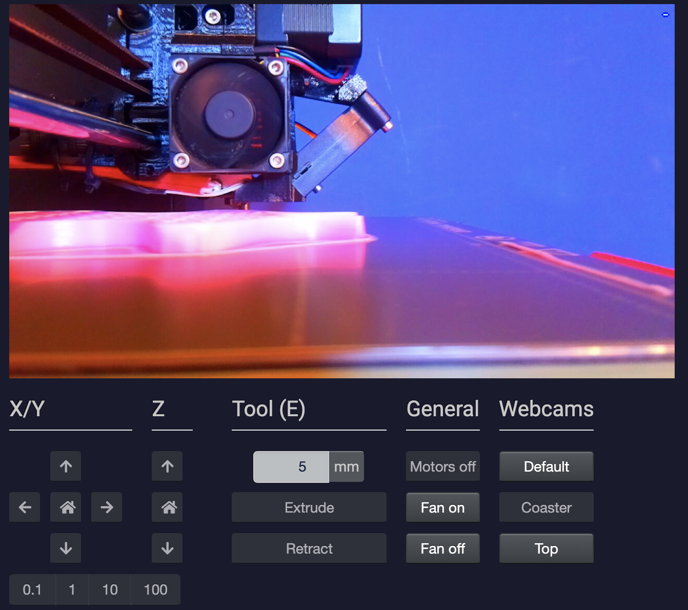 You can easily connect a webcam to OctoPrint to keep an eye on your print. OctoPrint can also take a photo of each layer printed, making a timelapse of how your printed object progresses.