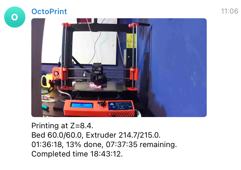 Some prints take hours, and then the Telegram plugin is handy. It offers a personal Telegram bot that sends the status of your print job every few millimeters via a text message, including a photo or GIF.