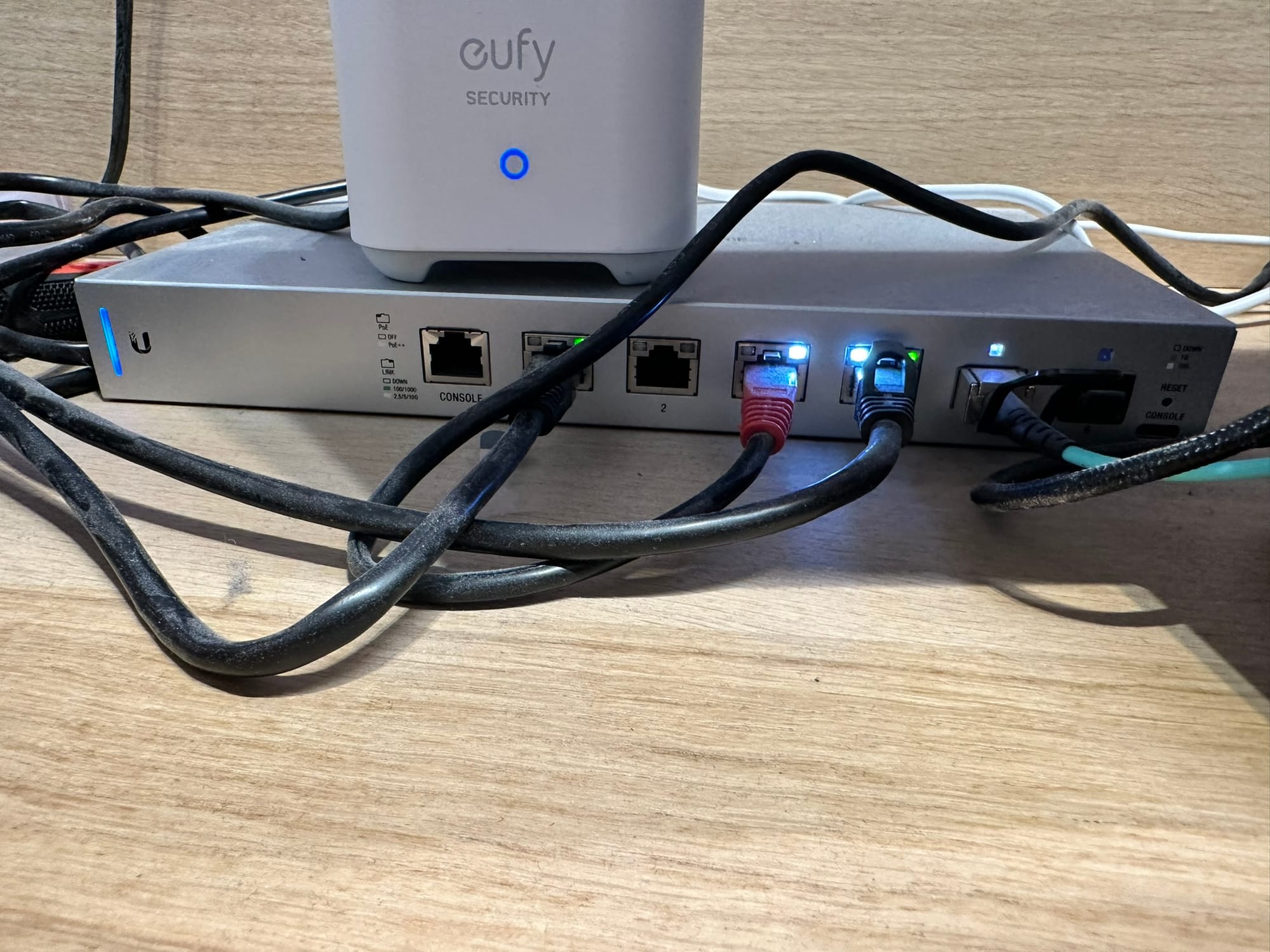 - A UniFi NeXt-Gen Gateway Pro, which is a 10 Gbps gateway. The CAT6 Ethernet cable that goes to the Proximus modem enters here. It has 2 SFP+ ports and 2 Ethernet ports. One is for the uplink (Internet), and one is for the downlink.