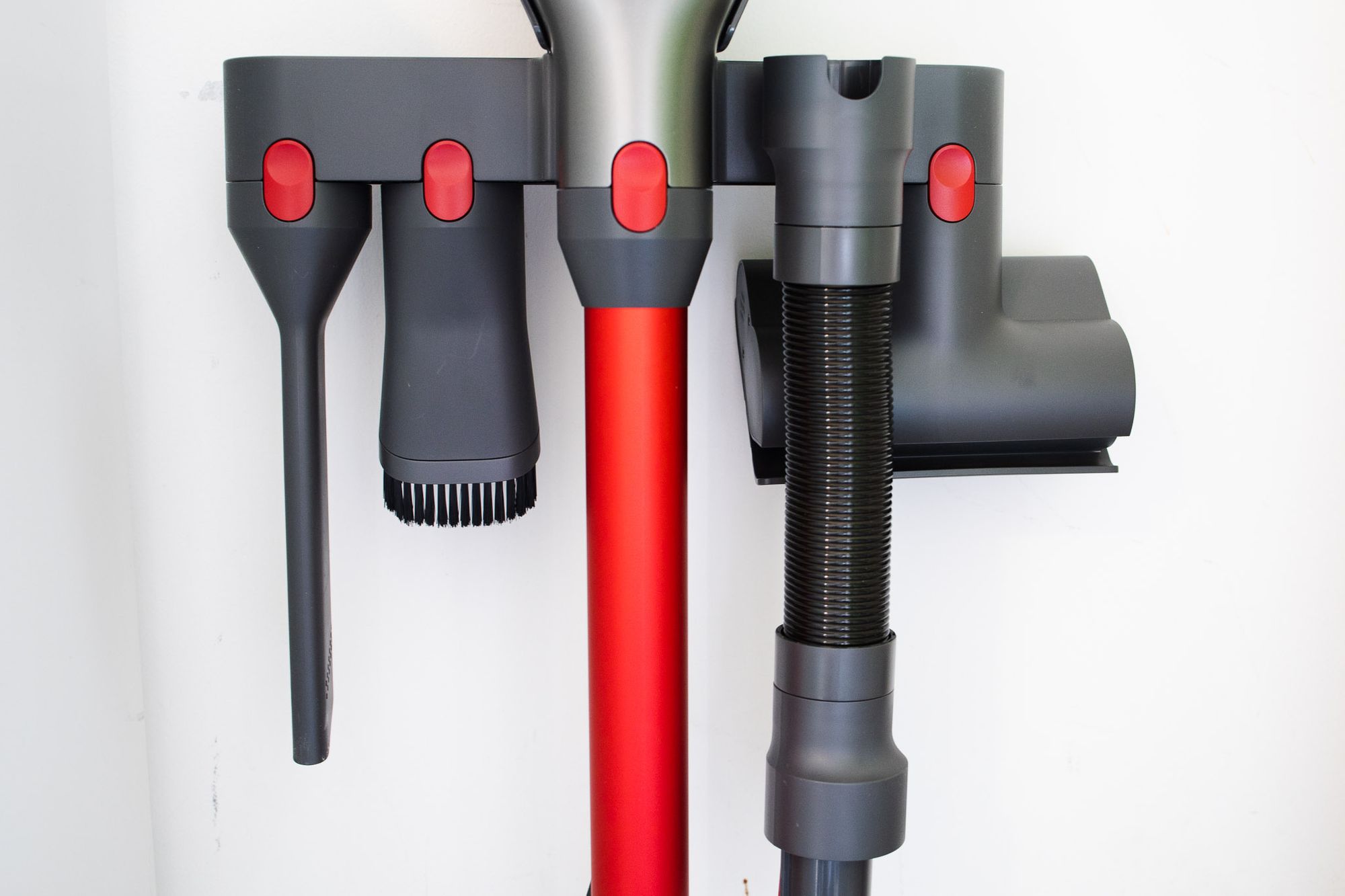 Daarnaast is er het handige ophangsysteem. Bij onze Dyson kregen we voor onze opzetstukken een zak, die vervolgens in een kast verdween. Het ophangsysteem van de H6 is breder en je kan er alle accessoires mooi aan kwijt.