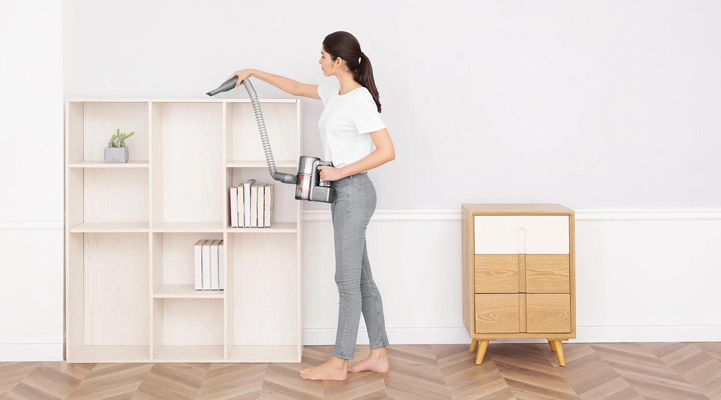 You have your standard motorized vacuum cleaner head, something for keyboard dust, a motorized small vacuum head, a crevice tool for crevices, and a flexible hose. The latter, which we did not have with our Dyson, has already proved useful for hard-to-reach places, as the woman demonstrates below.