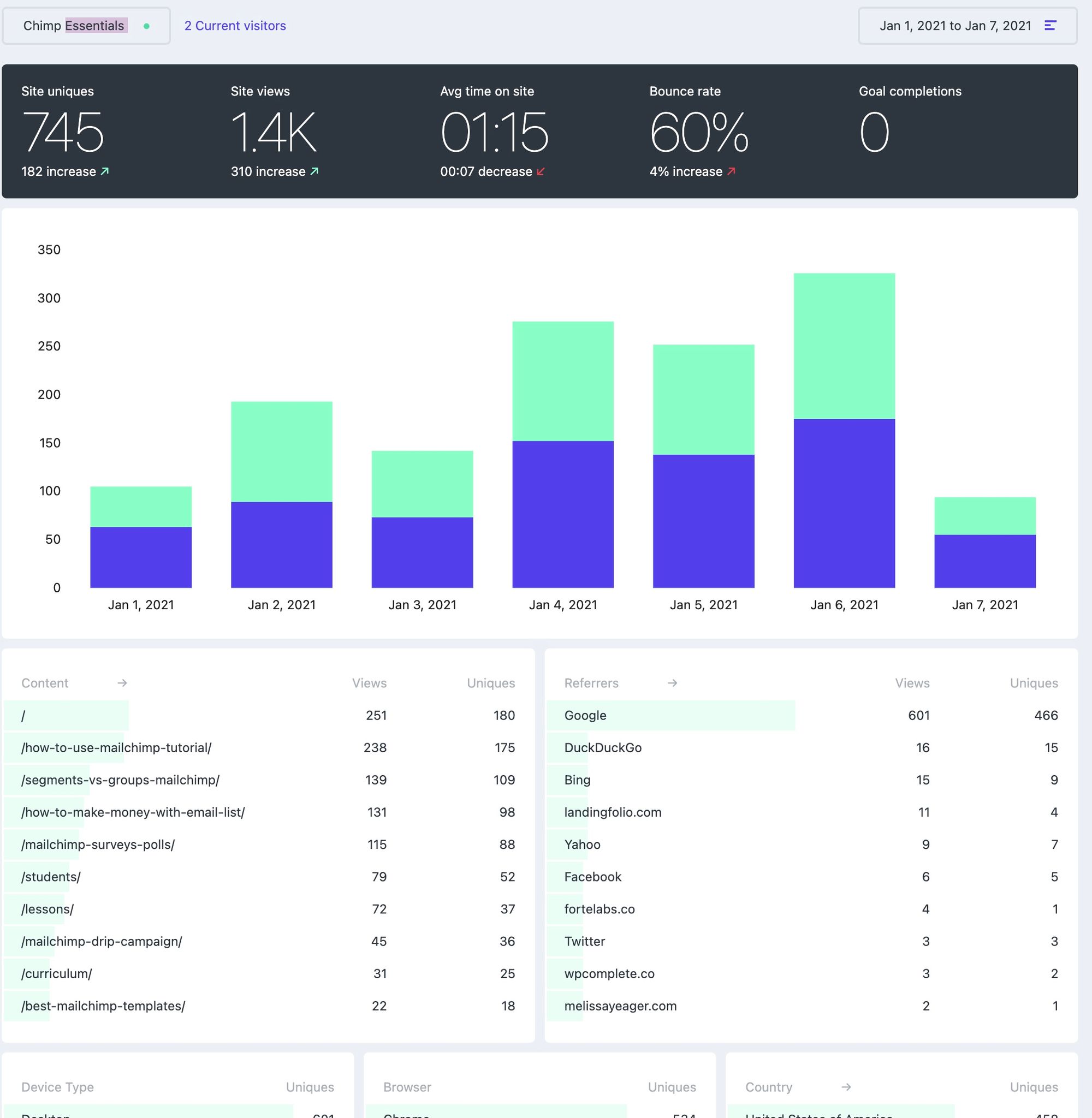 Hun dashboard ziet er iets mooier uit dan dat van Fathom, en ze zijn betaalbaarder: $6 / 10K pageviews en $12 / 100K pageviews.